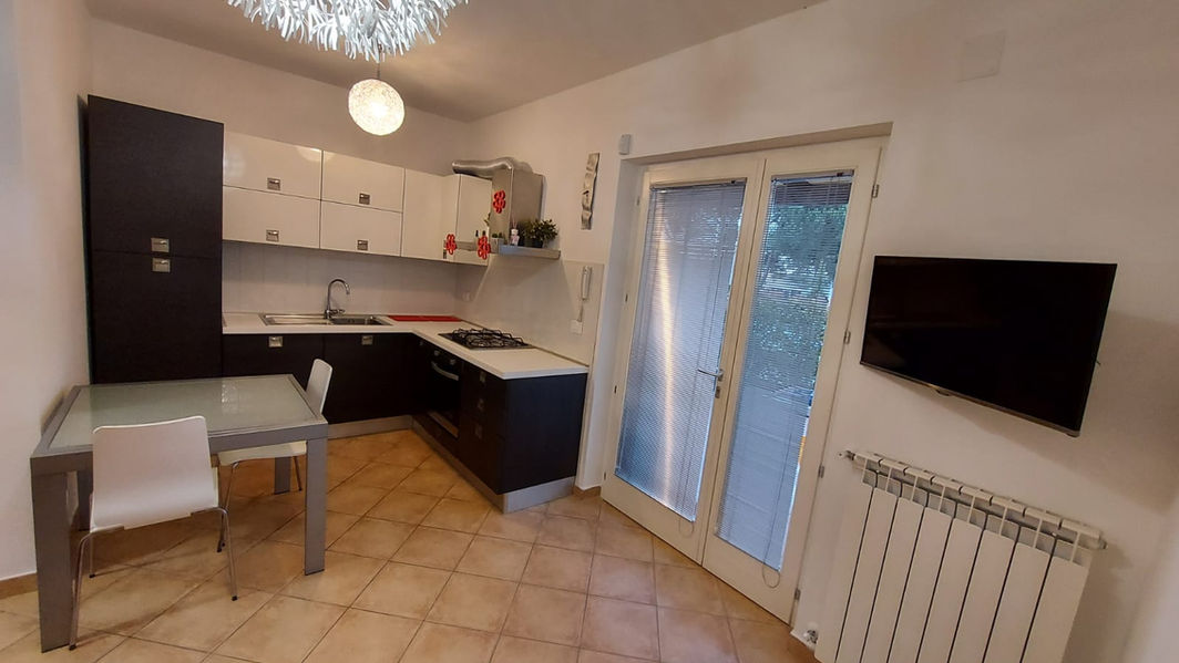 Trilocale al piano terra con giardino ed ampio spazio pavimentato con tettoia ideale per mangiare all'aperto, situato in zona tranquilla, arieggiata, luminosa lontano dal caos, dal traffico e dai rumori del centro a 800 metri dal mare. E' composto da ambiente unico con cucina-soggiorno con divano letto matrimoniale, lavastoviglie, frigo, forno e tv; una camera con letto matrimoniale, ampio armadio a 3 ante; una cameretta con letto singolo e armadio; bagno cieco con box doccia, wc bidet. Dispone di aria condizionata posta nel disimpegno in modo da climatizzare tutta la casa, zanzariere, lavatrice dislocata esternamente, asciugacapelli e ferro da stiro, posto auto.